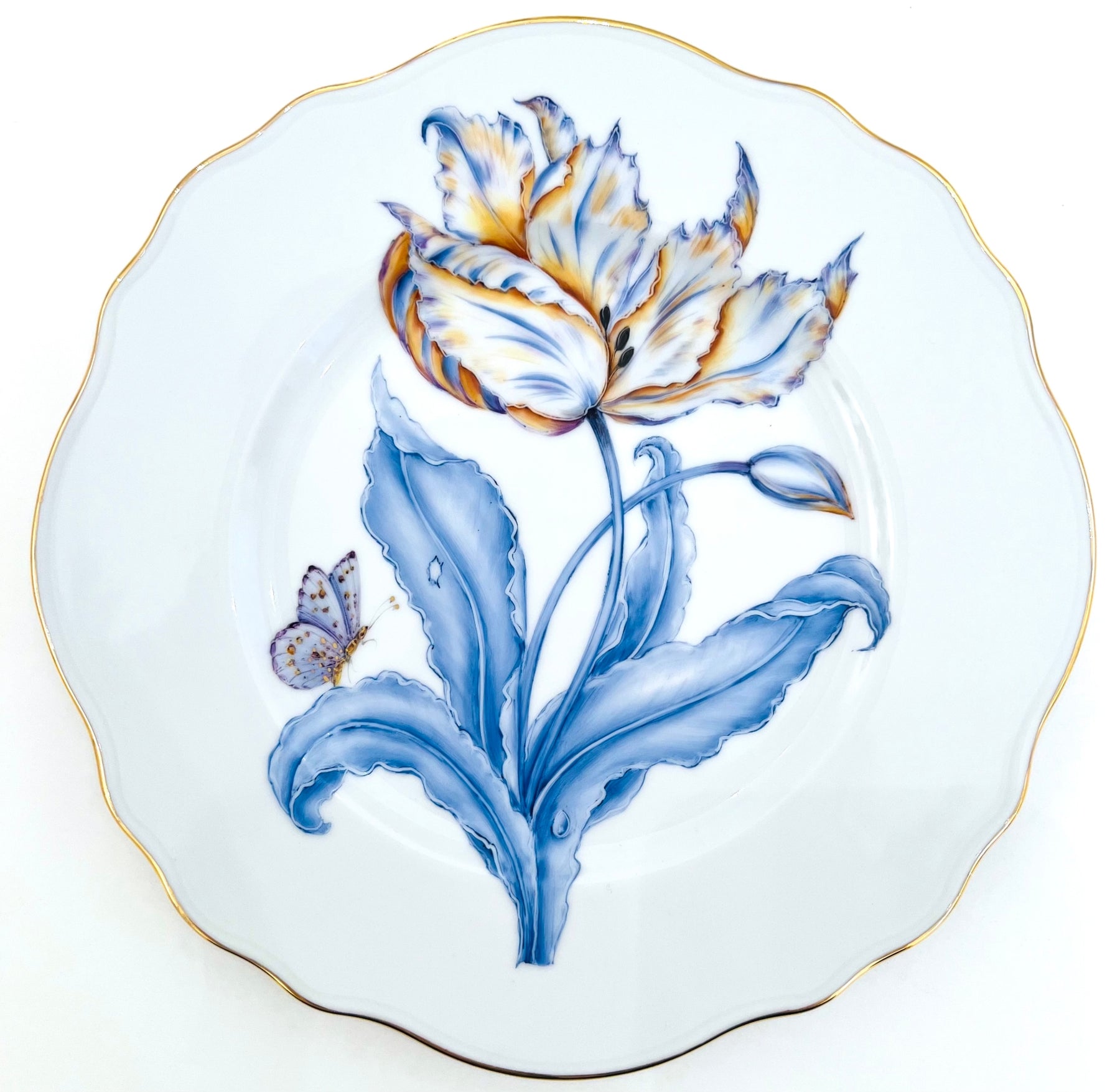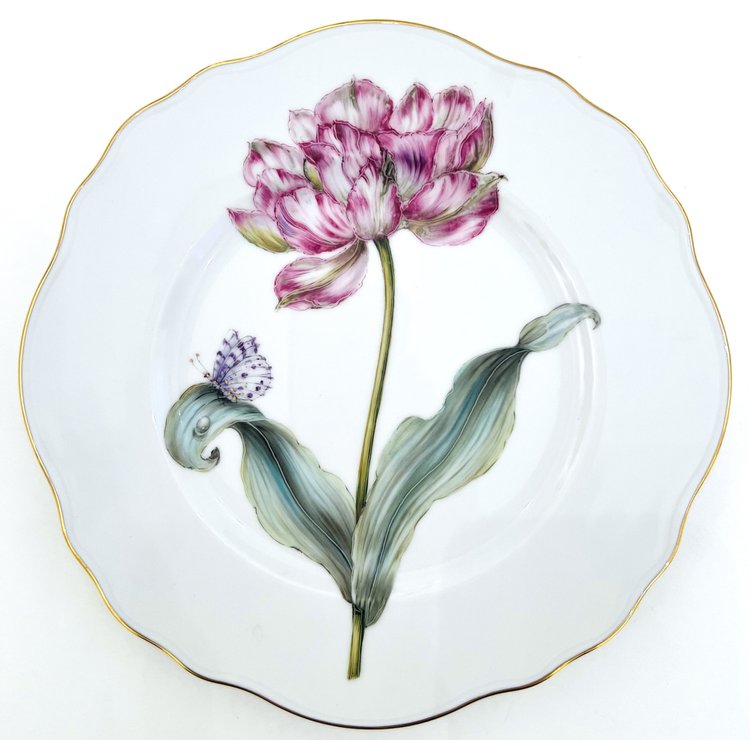 The plates are hand painted by a group of very highly trained master painters in her Budapest studio. This method of painting is a “dying art form,” the product of long hours of work on each object. The fine shading, the small brush strokes, the intricate details are result of very time consuming process. No mass produced decal design can be compared with these hand painted images.