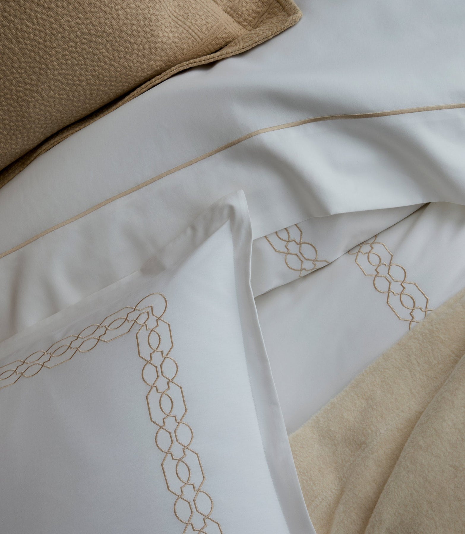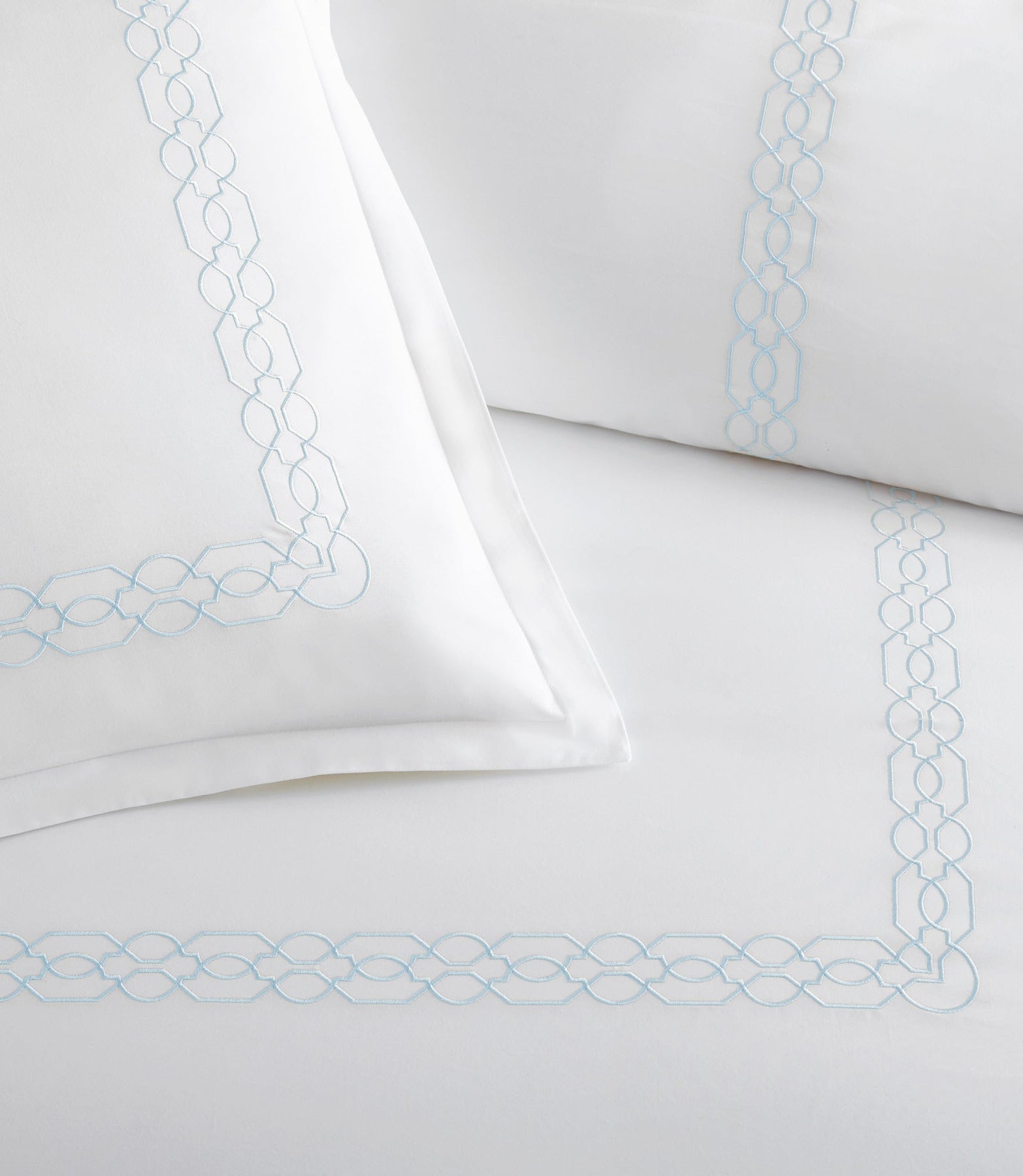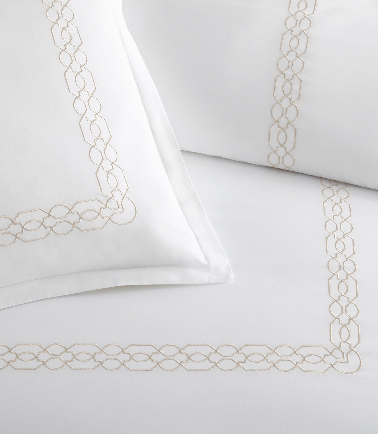 Taking its cue from classic hotel beds, our Embroidered collection exudes timeless appeal. Embellished with a geometric embroidered border in the Filigree motif, it introduces a refined tracery design that pairs beautifully with an array of patterns.