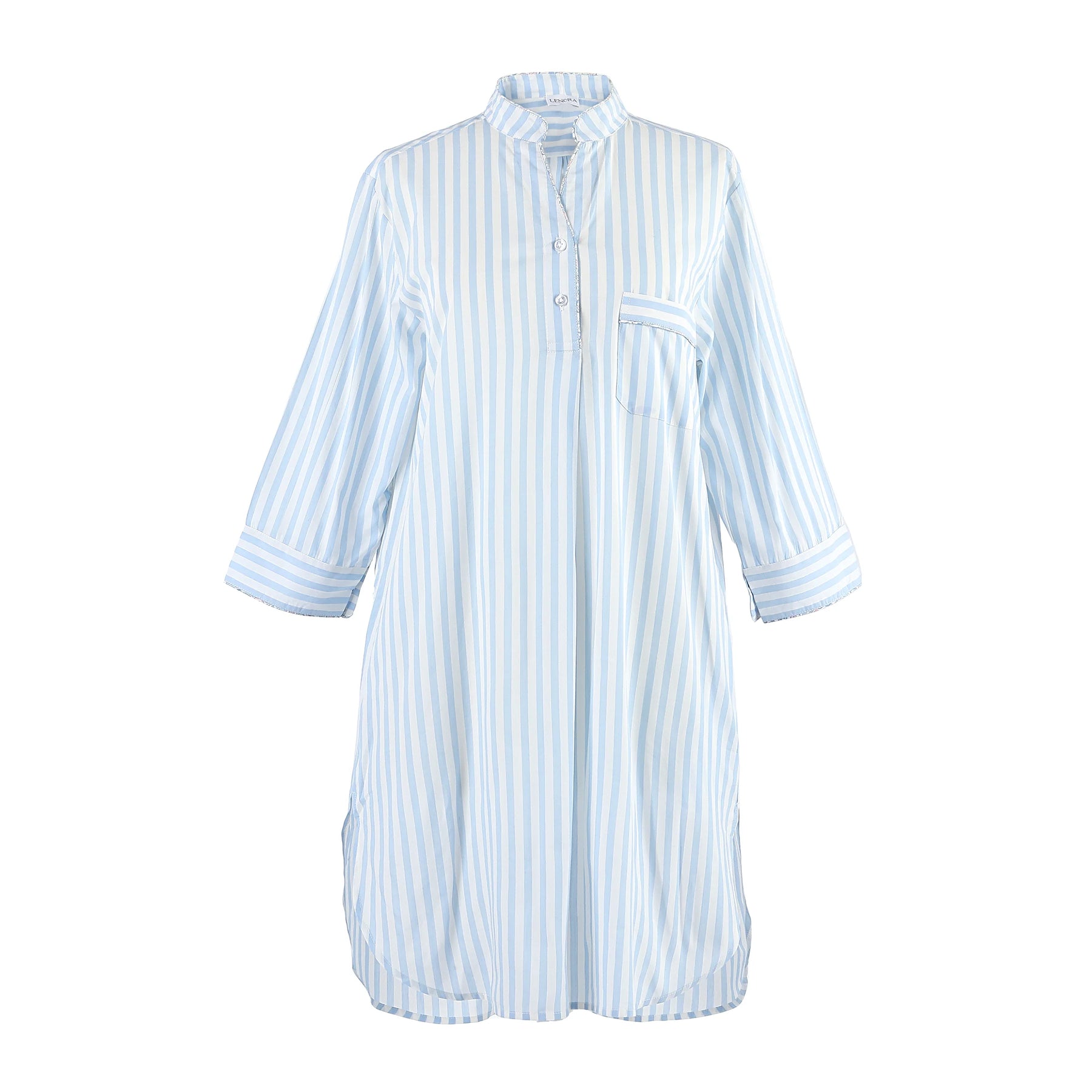 The Classic Stripe Nightshirt is a perfect blend of timeless style and cozy sophistication. Crafted from a breathable cotton blend, this ultra-lightweight nightshirt offers a soft, airy feel. It features elegant French Floral piping for a delicate, feminine touch. The Mandarin collar, two-button front placket, and banded ¾-length sleeves create a tailored yet relaxed silhouette. Thoughtfully designed with pockets for added convenience, this above-the-knee nightshirt is both stylish and practical. Available in blue or pink stripes.