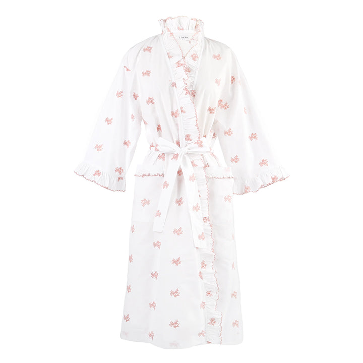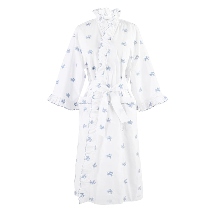 Experience the timeless charm of the Nancy Embroidered Robe. Crafted from 100% cotton, this midi-length robe is soft, breathable, and perfect for layering over your favorite nightgown. The delicate floral embroidery adds a feminine touch, while the ruffled trim along the front and sleeves enhances its elegant silhouette. Thoughtfully designed with practical pockets, this robe is as functional as it is beautiful. Available in white with pink or blue embroidery.