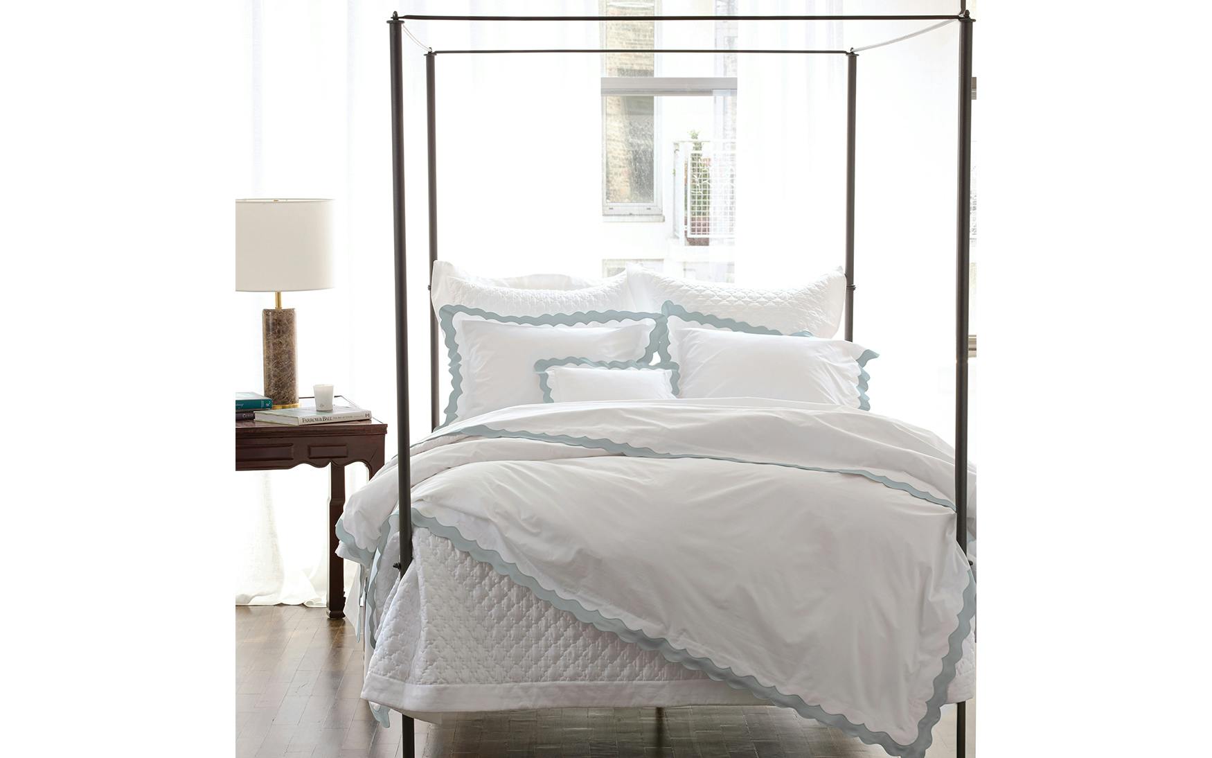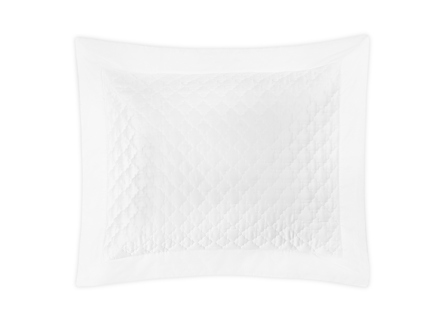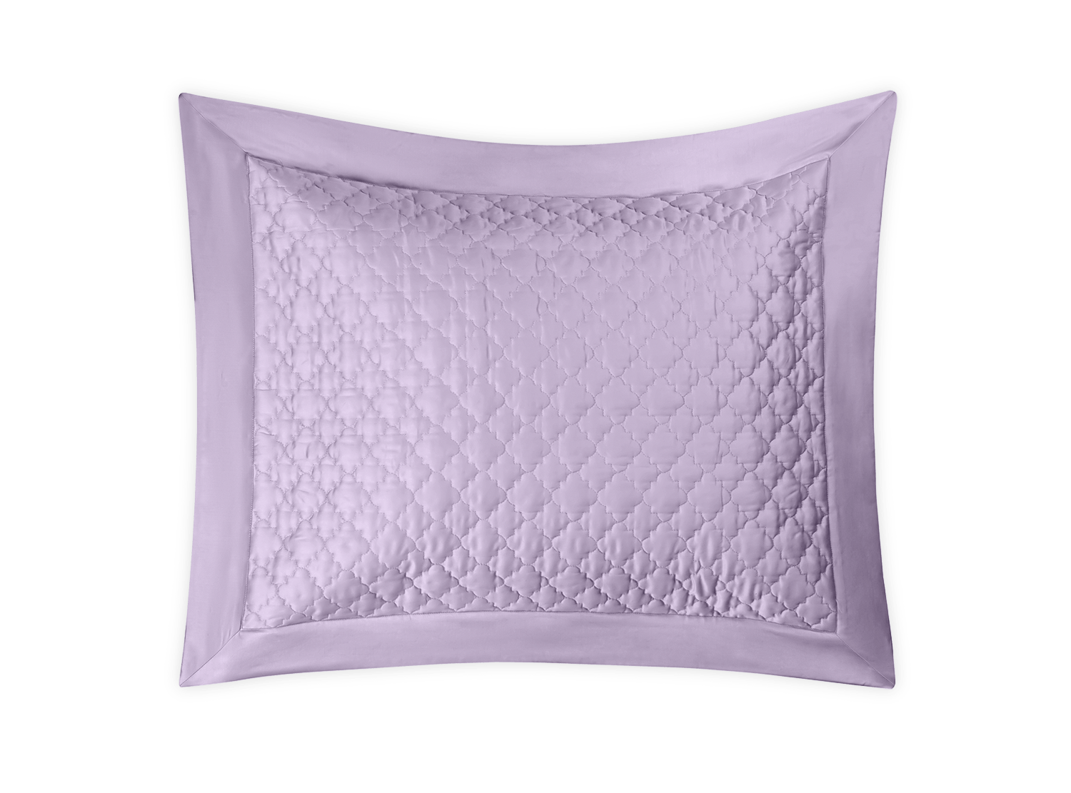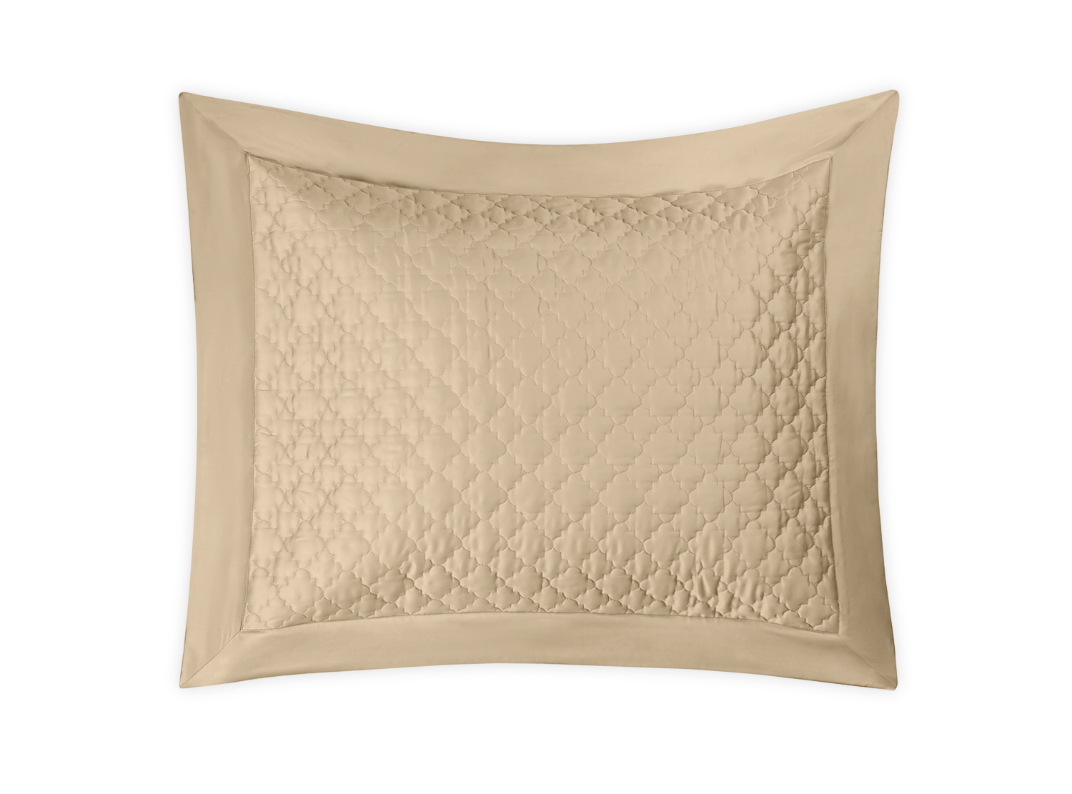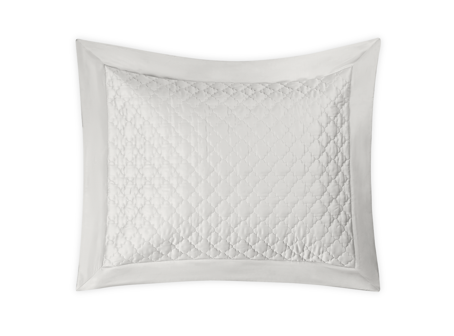 A decidedly modern fairytale look. Nocturne cotton sateen is adorned with a quilted quatrefoil design. The fabric has a subtle sheen that epitomizes a refined luxury for today’s home. A tailored, plain cuff on the quilt and shams adds the perfect finish.