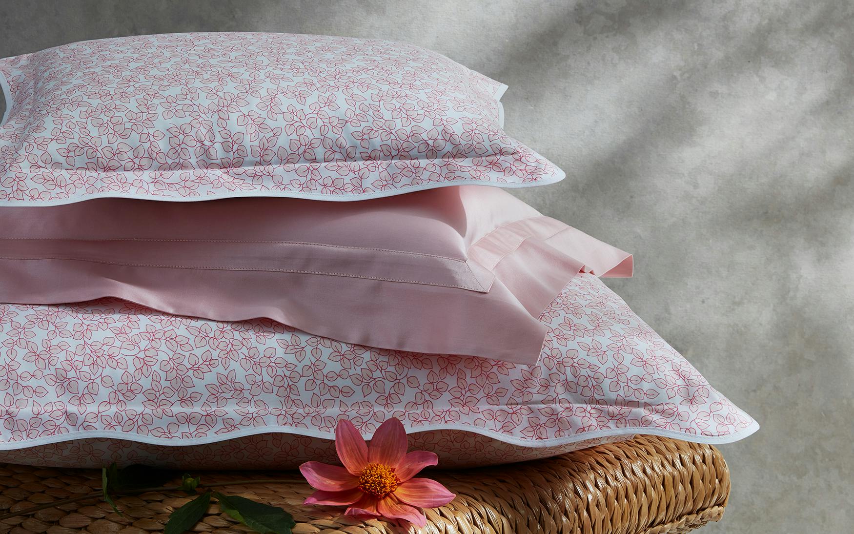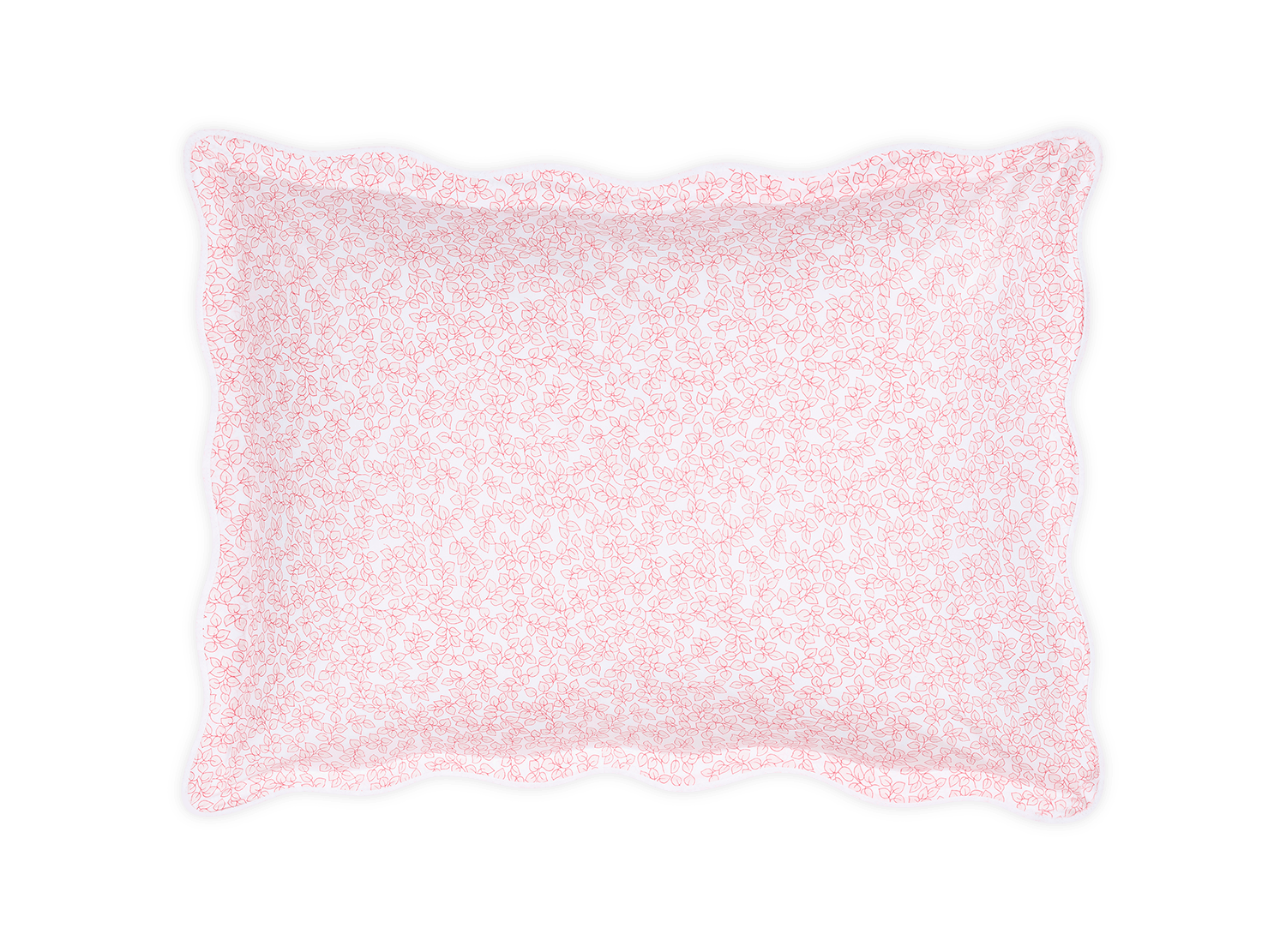 This sophisticated print is a true Matouk original, inspired by a textile found deep in our treasured archives. Margot's small, simply drawn leaves fit snugly together on our 500 thread count Luca Egyptian cotton percale, for a pattern that nearly reads as a solid color. The edges of each piece are finished with a subtle white scallop.