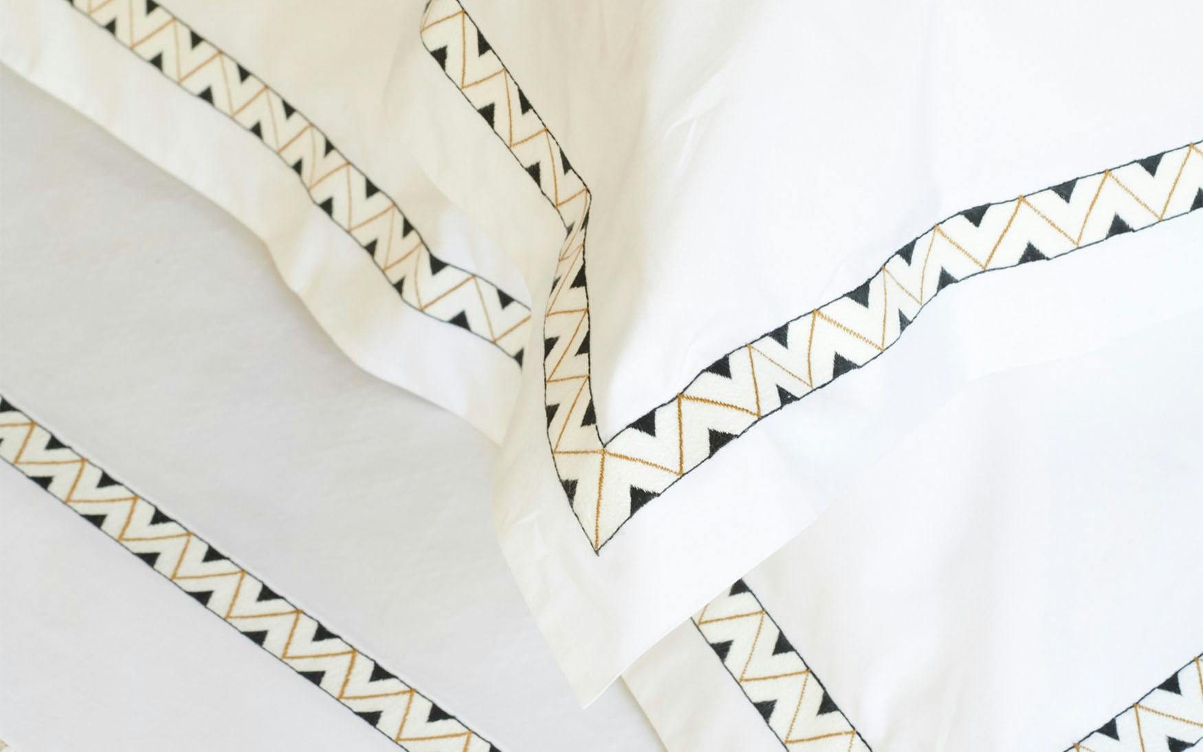 Prado creatively combines a chic Schumacher design and a classic Matouk construction, with breathtaking results. We’ve placed the Prado pattern on our crisp 520 thread count Ceylon percale as we would a tape detail, but here the pattern is fully embroidered instead. The finished product has a crisp, tailored look with a delicious pop of colorful decoration.
