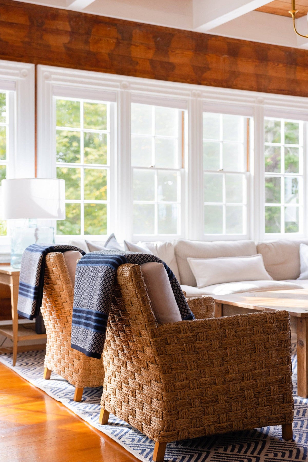 Oh Captain, my Cozy. A classic New England birds eye pattern meets blue-on-blue stripes for an eye-catching design that makes a bold and memorable statement, from porch swing to sofa.